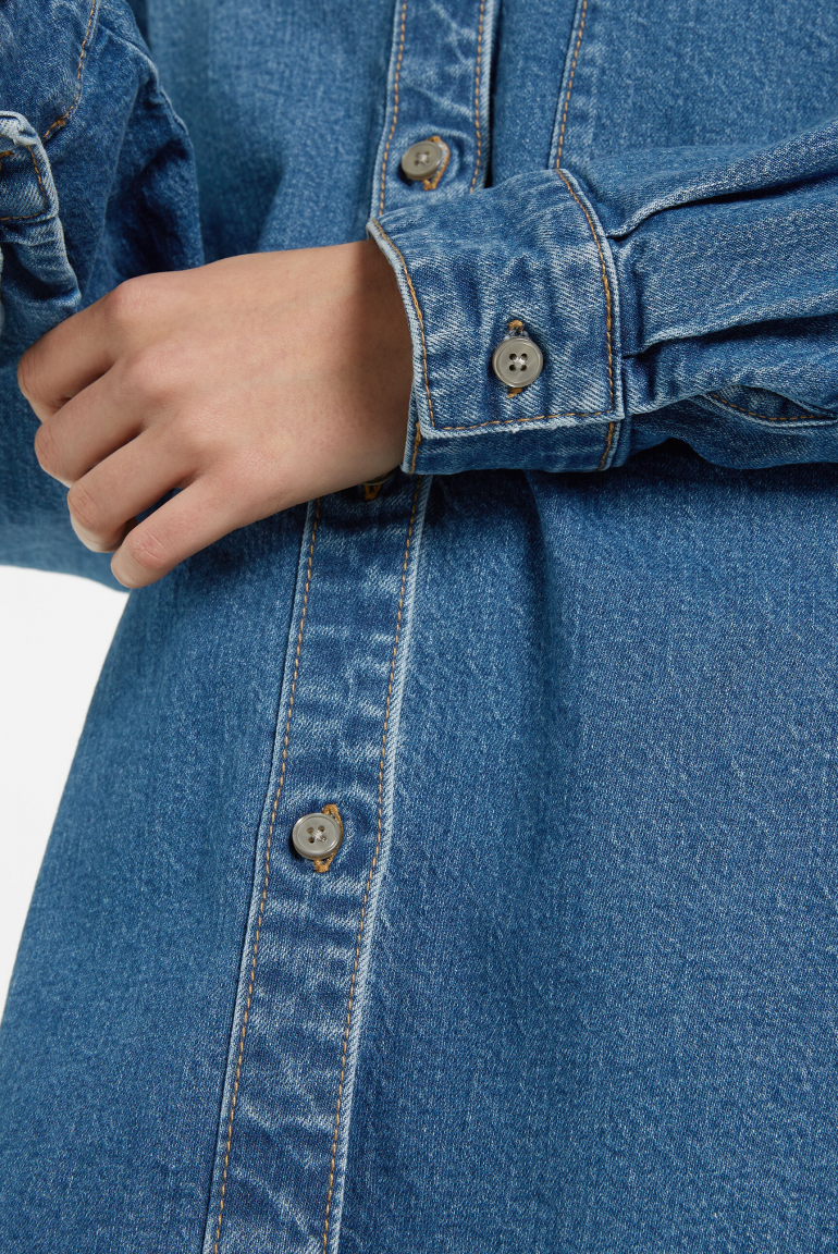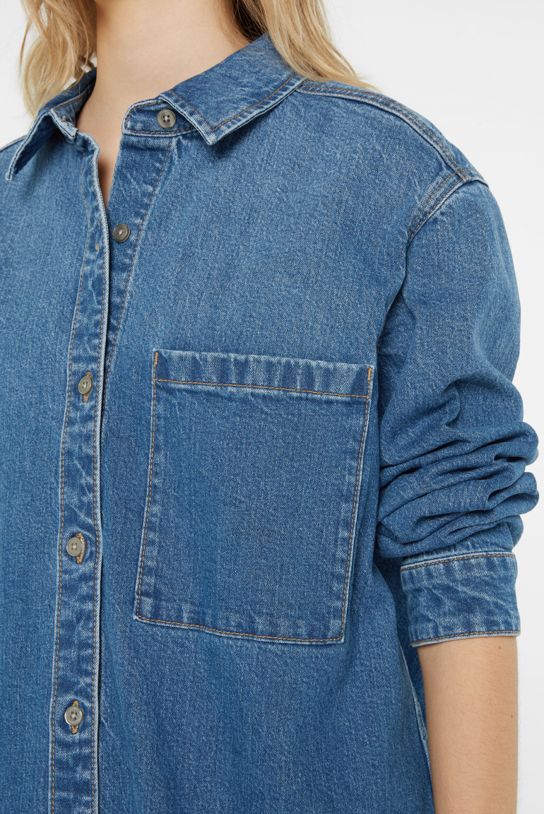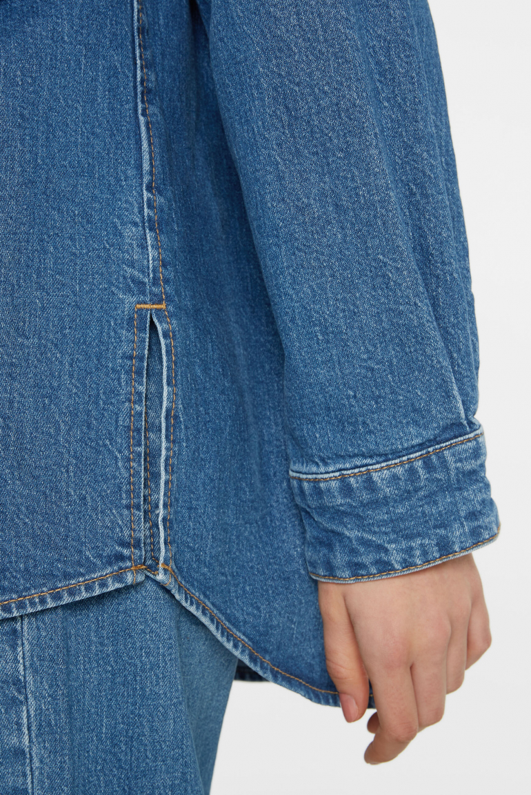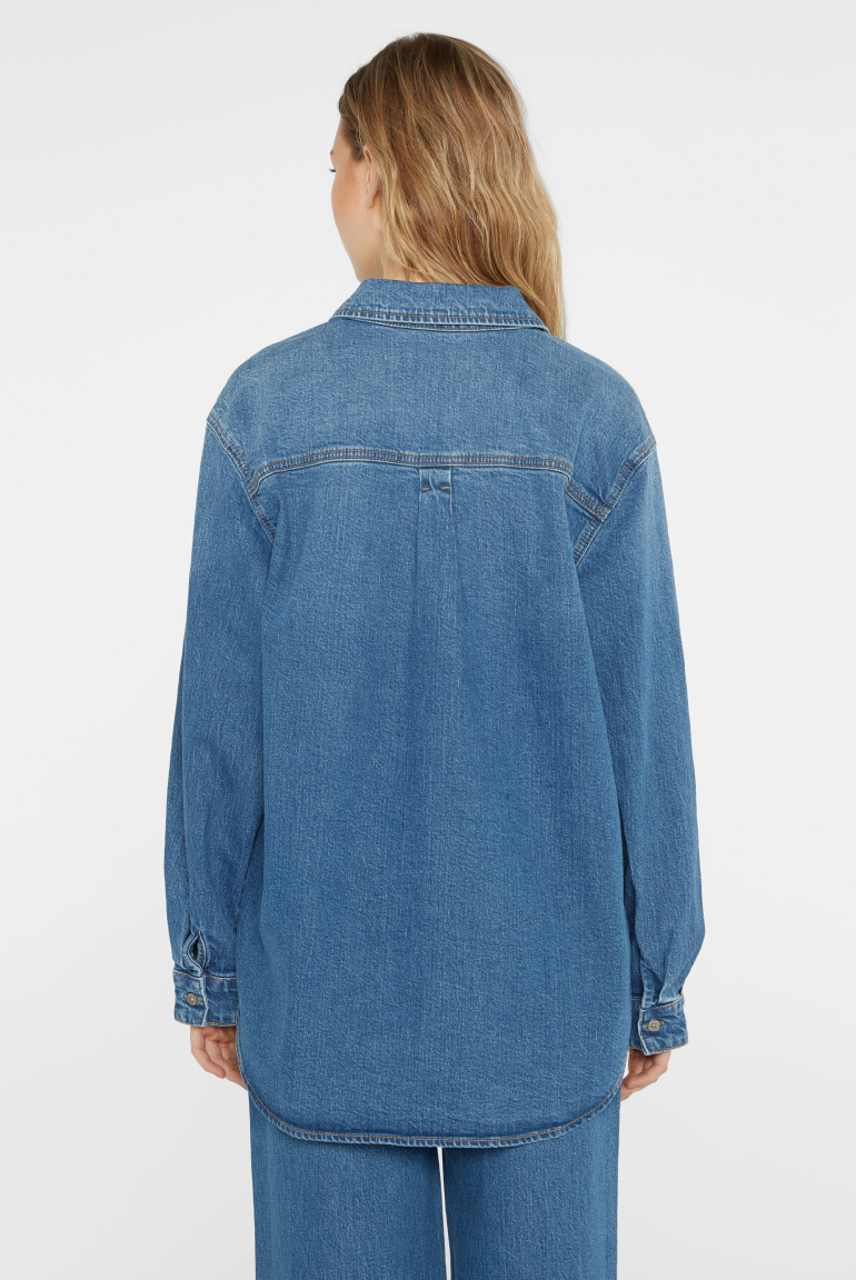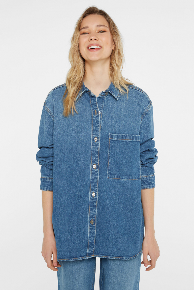Double-Denim Days! Mittelblaue Denimstoffe sind wieder da und begeistern mit ihrer stilvollen Ausstrahlung. SENSES.THE LABEL kommt mit einer gerade geschnittenen Blusenjacke im Denim Look, smart geknöpft und mit einer aufgesetzten Brusttasche. Verdammt gut sieht sie mit der passenden Jeans aus. Als Jacke getragen setzt sie den Fokus auf jedes Oberteil das darunter hervorblitzt. Das Model ist 178 cm groß und trägt Gr. XS/S.