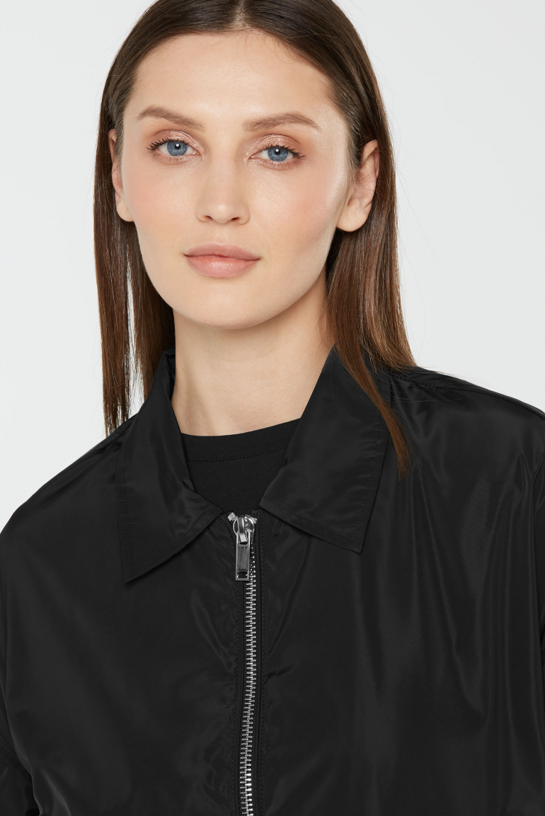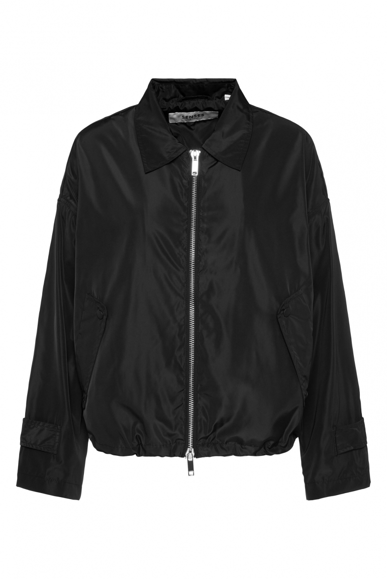 Jacken setzen in Sachen Styling wieder Akzente! Die modische Kurzjacke mit Turn-Down-Kragen von SENSES.THE LABEL kommt im leichten, sportiven Nylon-Look. Sie hat einen weiten Ärmel mit einer verstellbaren Druckknopfmanschette und seitliche Einschubtaschen mit Druckknopfklappe. Die kastige Form lässt sich im Saum mit einem Gummizug regulieren. Sie sieht sehr elegant aus und kreiert viele schöne Casual- und Office-Looks. Das Model ist 177 cm groß und trägt Gr. XS/S.